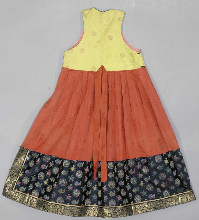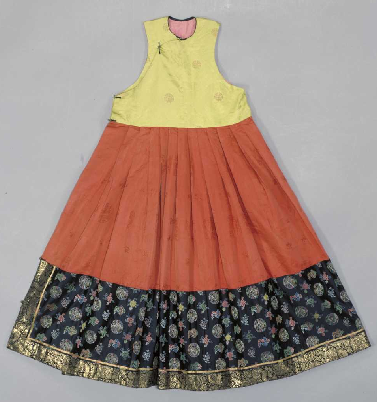 朝裙面料由三部分组成,上部为浅绿色团龙圆寿字暗花缎,中部为红色云龙圆寿字织金缎,下部为石青色团龙妆花缎,裙边镶银、赤、黄三色金边和石青片金勾莲纹缎边各一道。朝裙内衬粉红色云蝠纹实地纱和折枝暗花绸里。