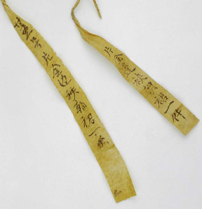附黄条,墨书:“片金边袷朝裙一件,咸丰十年四月初四日收金环交。”
