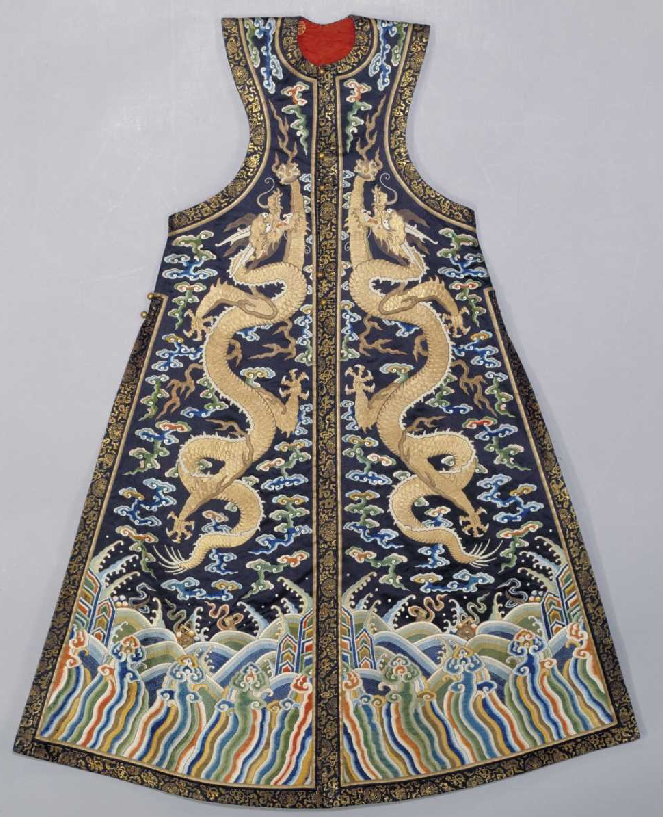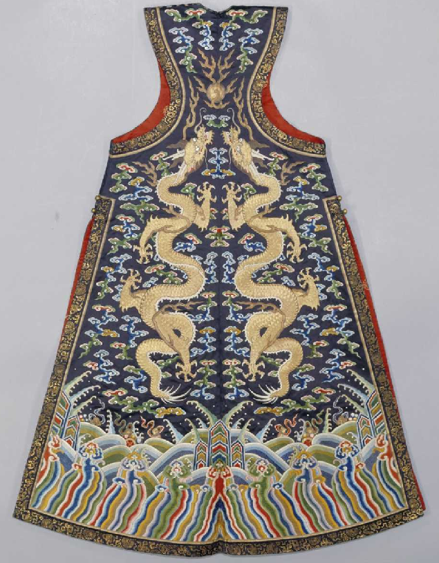 朝褂为无袖对襟式,左右开裾。褂用石青色素缎做面,内衬大红色四合如意云纹团龙团寿织金缎里。通身以五彩丝线和金线绣制纹饰,前后身绣立龙各二,周围点缀五色云,下幅饰八宝平水。褂边镶三色金边和石青色团龙杂宝纹织金缎边各一道。