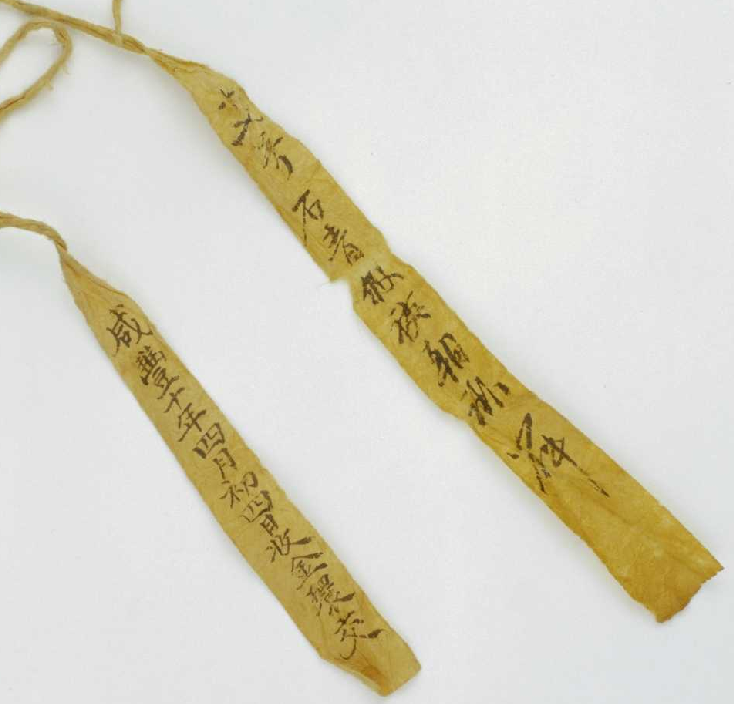 附二黄条,墨书:“石青缎袷朝褂一件”、“咸丰十年四月初四日收金环交”。