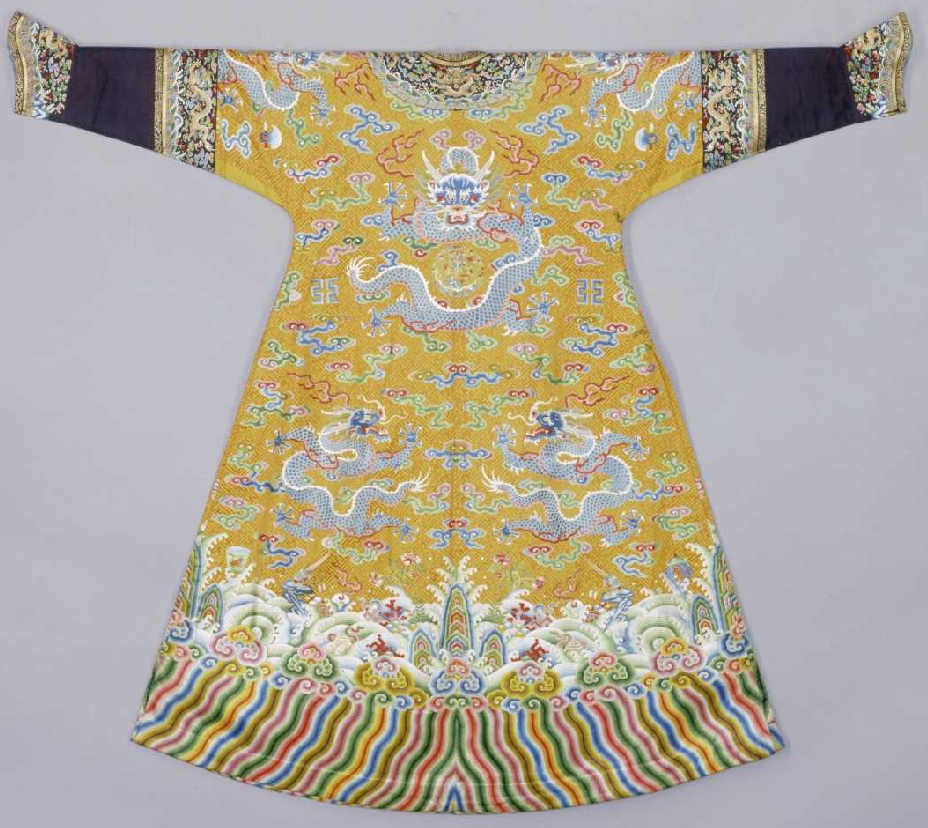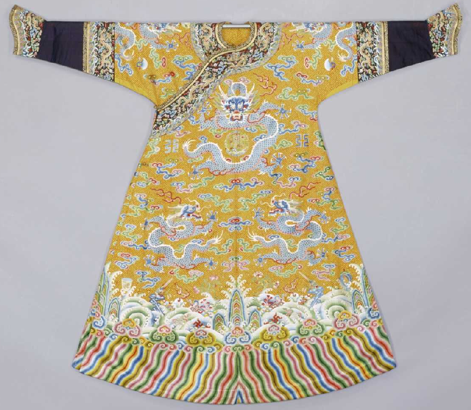 明黄色纱双面绣万字地云龙纹单袍,清咸丰,身长147cm,两袖通长173cm,袖口宽20cm, 下摆宽126cm,左右开裾长82cm。清宫旧藏。