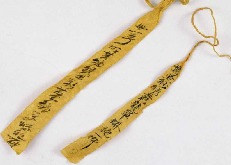 领口系墨书黄纸签,正面书:“鹅黄纱绣五彩龙单蟒袍一件”,背面书:“咸丰三年正月二十日,布呼交”。