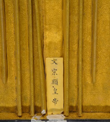 此为咸丰皇帝使用的朝珠,由一百零八颗东珠组成,间以红珊瑚佛头四。佛头两侧分别有两颗蓝晶石珠;顶端佛头下连缀一红珊瑚佛头塔,塔下以明黄色绦带系椭圆形金累丝嵌红宝石及珍珠背云,上下各有珊瑚蝙蝠形结一,垂金累丝点翠托翡翠坠角。松石记念三串,下垂金累丝点翠托红、蓝宝石、碧玺坠角各一。整盘朝珠放于黑色漆屉内,附黄条,其上墨书:“文宗显皇帝”,上盖黄色单袱。