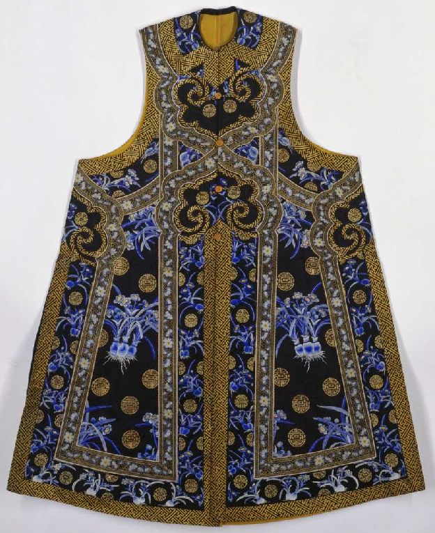 石青色纱绣水仙团寿纹袷坎肩,清同治,身长138cm,肩宽44cm,下摆宽117cm。清宫旧藏。