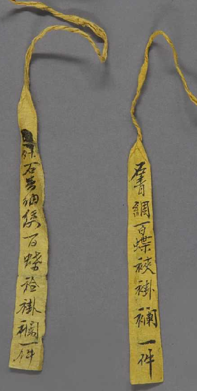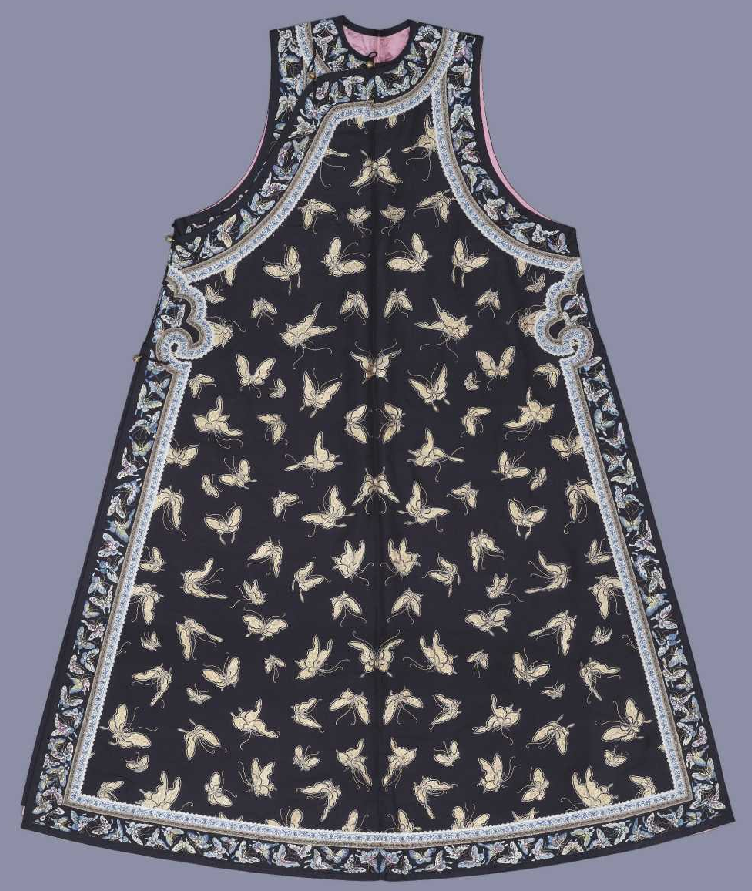 大坎肩又称为“褂襕”,是清代后妃春秋季节穿着在衬衣外面的便服。圆领、大襟右衽,无袖,身长及踝,左右开裾,直身式。内衬粉色四合如意缠枝花卉暗花绫里,缀铜镀金錾花扣四枚。领口系墨书黄纸签二,一书“石青绸绣百蝶夹褂襕一件,同治二年五月十七日收,沈魁交”,一书“石青绸绣百蝶夹褂襕一件”。面料为元青色素斜纹绸,平金绣百蝶纹。蝴蝶图案左右对称,规矩工整,使用平金技法绣蝴蝶,用银线勾边,尤显得端庄稳重,华贵大方。边饰为白地长寿字蝴蝶纹绦,香色小朵花绦,元青绸五彩绣百蝶边,与面料祝福长寿的主题相呼应。其中元青绸五彩绣百蝶采用丝线彩绣技法,与面料有所不同,针法既工整又有变化给主题增加了活力。