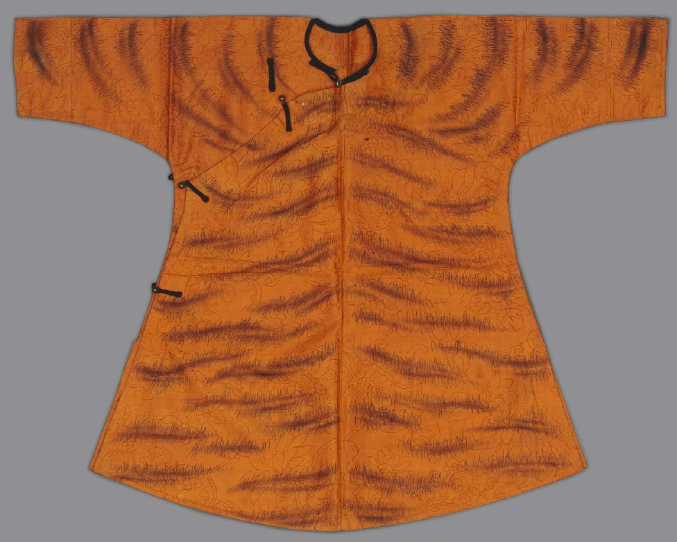 此为同治皇帝幼年时夏季便服。圆领、大襟右衽,平袖端,左右开裾、直身式袍。杏黄色菊蝶纹实地纱面料,上绘虎皮纹,实地纱织造平滑细腻,纱孔规矩通透,穿着透气凉爽。