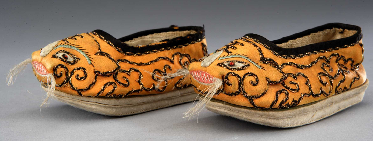 虎头鞋与虎头帽一样也是中国传统的儿童服饰,均具有驱祸避邪保平安之吉祥寓意。通常虎头鞋与虎头帽多同时穿用,且有男穿红、女穿绿之俗,而寓含其中的“无病无灾长大当官”、“望子成龙”、“望女成凤”等吉祥寓意则表达了父母对孩子的美好愿望。因此,无论是宫廷还是民间,人们都喜爱为孩子穿上美观大方的虎头鞋,以祝福孩子健康成长。