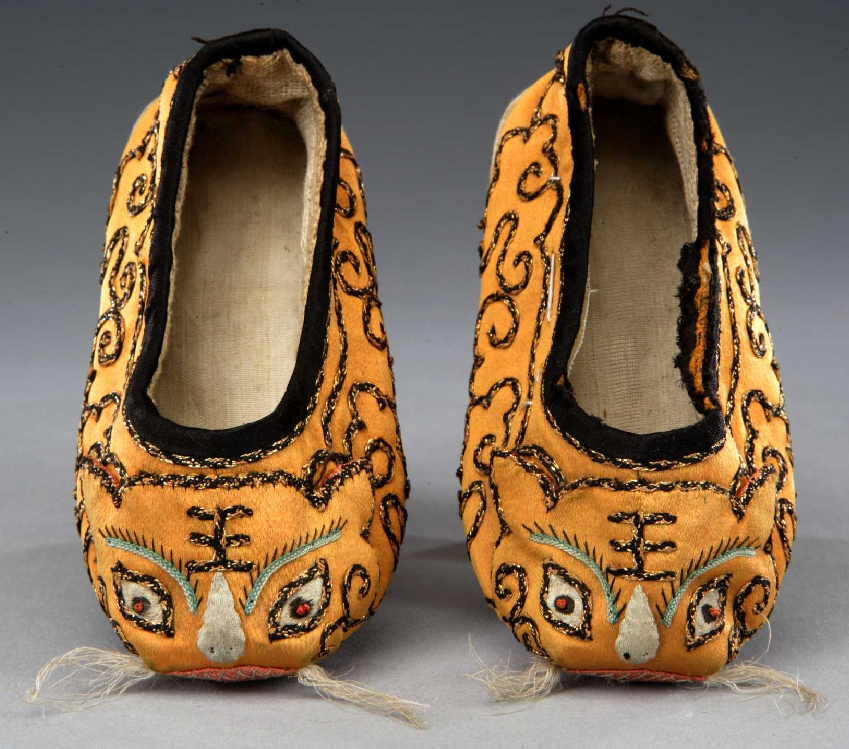 黄缎钉金线虎头小袷鞋,清同治,长12cm,高4.7cm。清宫旧藏。