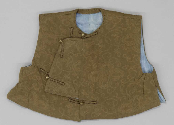 此棉坎肩是清代同治皇帝幼年时的衣服,春秋穿着在便袍外面。款式为圆领,无袖,左右开裾,琵琶襟。坎肩以四合铃杵纹暗花绉绸为面,月白色素绫里,絮薄棉,使之穿着柔软舒适。缀铜质光素扣4枚。