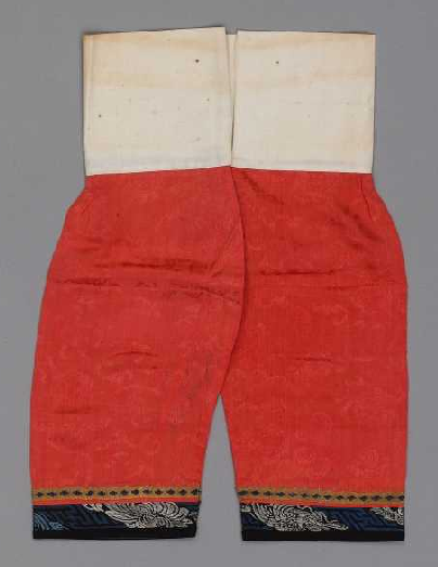 此为清宫中公主婴儿时期穿用的连裆裤。桃红色暗花绸为面,月白色素绸为里,腰围镶白色细棉布,裤口镶黑色地蓝“卍”字花卉纹绦边和黄色小朵花纹绦边。具有穿用轻便舒适的特点。