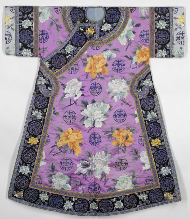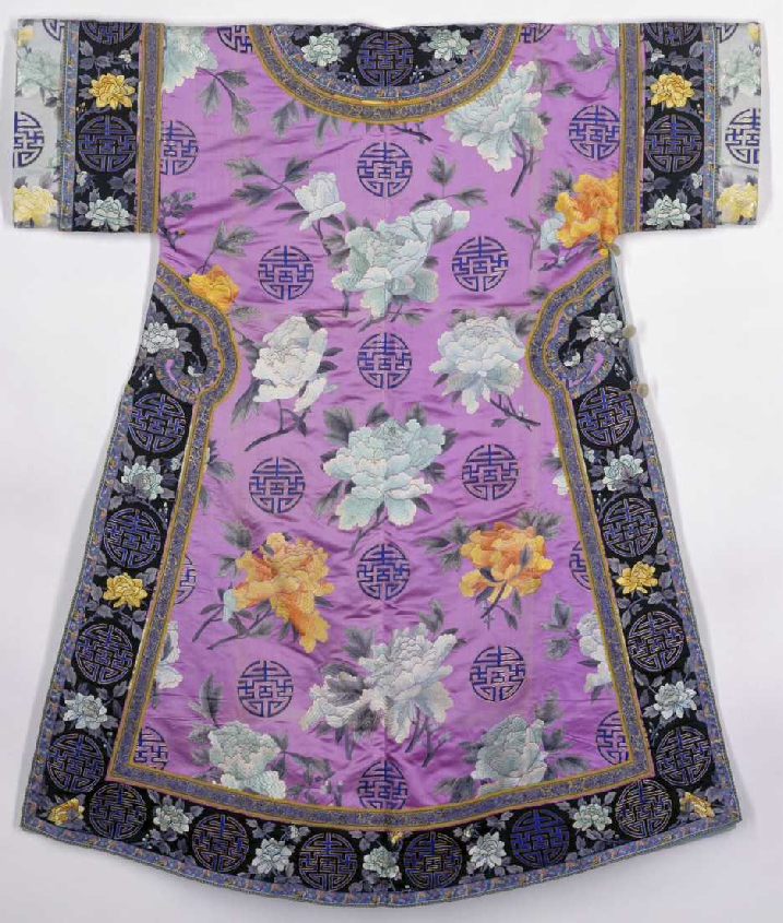 藕荷色缎绣牡丹团寿纹袷ꘑ衣,清光绪,身长137cm, 两袖通长122cm,下摆宽118cm。清宫旧藏。