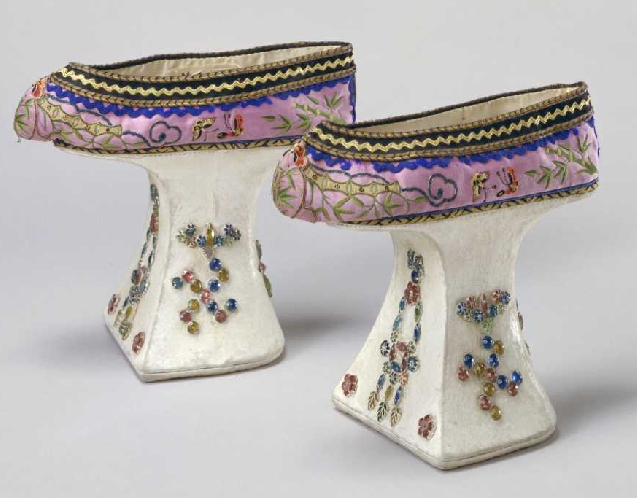 此鞋为清宫内务府造办处制作。其底形似花盆,以木材为料,外髹白漆,四周钉缀彩色料石作卍字、蝙蝠和彩带等纹样,谐寓“万代福寿”。鞋帮使用雪青色缎,其上绣制竹蝶纹。鞋口处镶以金线盘成的曲水纹绦边。此鞋做工精巧,秀丽华美。