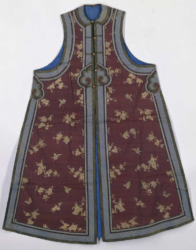 此衣为苏州制作,丝质。长款,圆领,对襟,无袖,裾左右开。衣缘饰绦边三重。缀铜鎏金錾花扣五颗。衣内衬月白色素纺丝绸里。