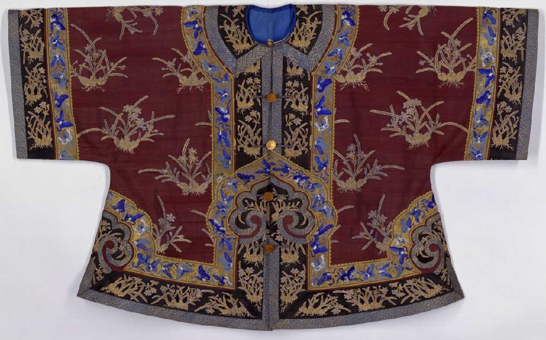 此衣为丝质。圆领,对襟,平阔袖,左右及后开裾。缀铜鎏金錾花扣一枚、铜鎏金机制币式扣四枚。衣缘饰绦边三重。衣内衬月白色素纺丝绸里。此衣在绛色平纹地上采取平缂、构缂等技法运用圆金线缂织整枝水仙纹样,构图生动,充满生活气息,特别是蝴蝶图案绦边的围衬,静中有动,别具一番情趣。