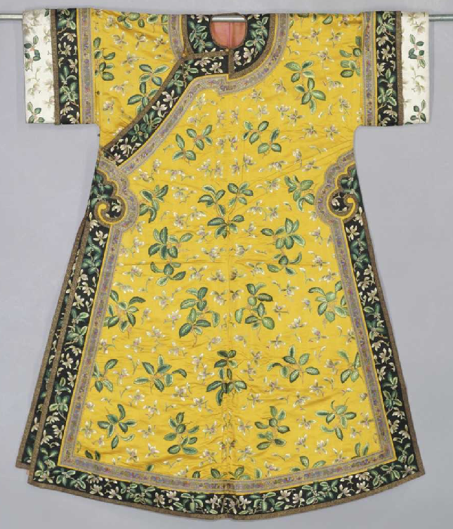 衣圆领,大襟右衽,平袖,裾左右开。ꘑ衣采取二至四色间晕与退晕结合的装饰方法,在明黄色缎地上运用套针、平针、钉线、平金等针法彩绣桂花和紫玉兰纹样,谐寓“兰桂齐芳”。衣内饰粉色蝴蝶纹直径纱里,衣外镶石青色缎绣玉兰、桂花领、袖边及石青万字织金缎边,内钉香色二龙戏珠丝织花绦,缀铜鎏金錾花扣三枚。