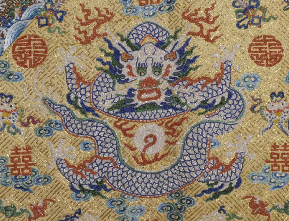 此袍圆领,右衽大襟,镶中接袖和石青色素接袖,马蹄形袖端,裾左右开。明黄色素缎面,湖色团龙寿字云纹暗花缎里。袍身以盘金技法绣万字曲水地纹,再在地纹上绣制纹样,除云纹、立水纹和十二章用五彩丝线绣制外,其他如龙纹、红圆寿字纹、红双喜纹和八宝纹等用白色米珠、红珊瑚珠和蓝、绿、紫、黄等各色料珠缉制。袍身列十二章,饰龙纹九,其中两肩、前后身正龙各一,下襟前后行龙各二, 里襟行龙一。另在领边饰正龙二、行龙三,两中接袖饰行龙各二,两袖端饰正龙各一。此袍色彩丰富,纹样精美,绣工繁复,代表了清刺绣工艺的最高水平。