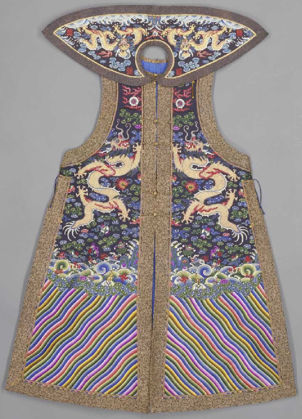 此为清代皇后或皇太后春秋礼服之一,穿用于重大典礼等场合。圆领,对襟,无袖,左右开裾。缀铜鎏金錾花扣五枚。缘饰石青菊花纹织金缎边,内衬月白色素纺丝绸里。采用二至三色间晕与退晕相结合的装饰方法,在石青色绸地上,运用平针、套针、戗针和平金等针法,绣制彩云金龙、海水江崖及杂宝等纹样。两条金色行龙在五彩祥云的衬托下,从海水中腾空而起,气势矫健雄伟。