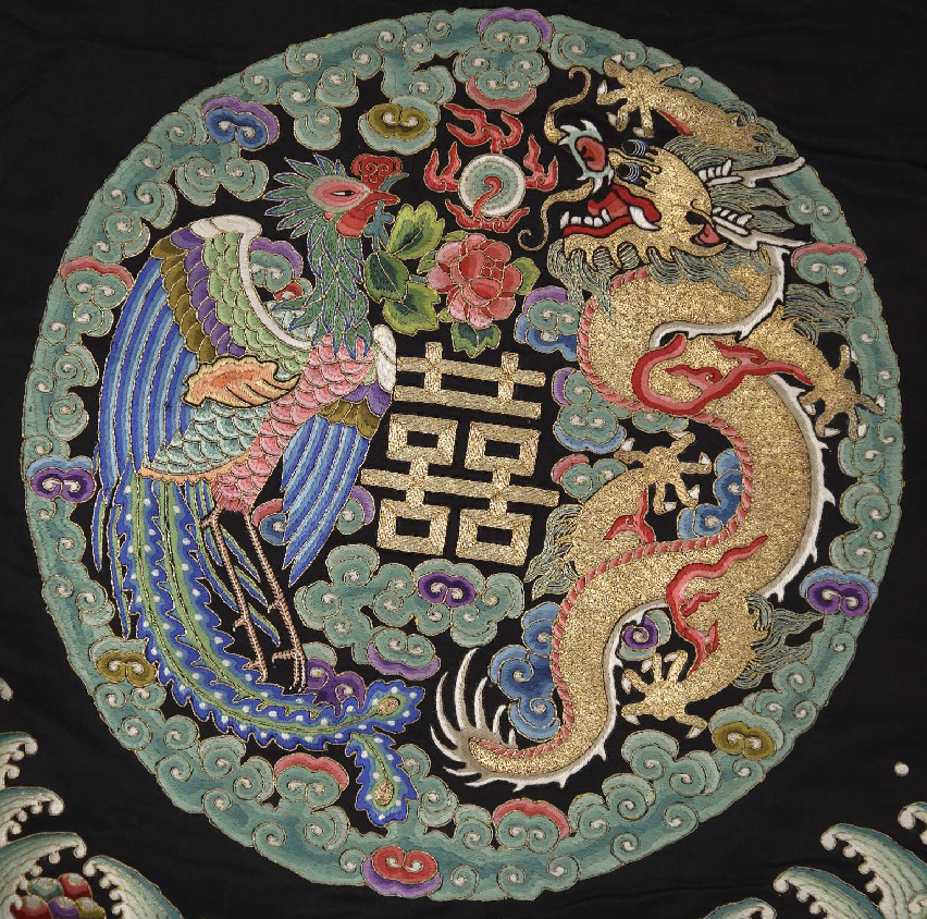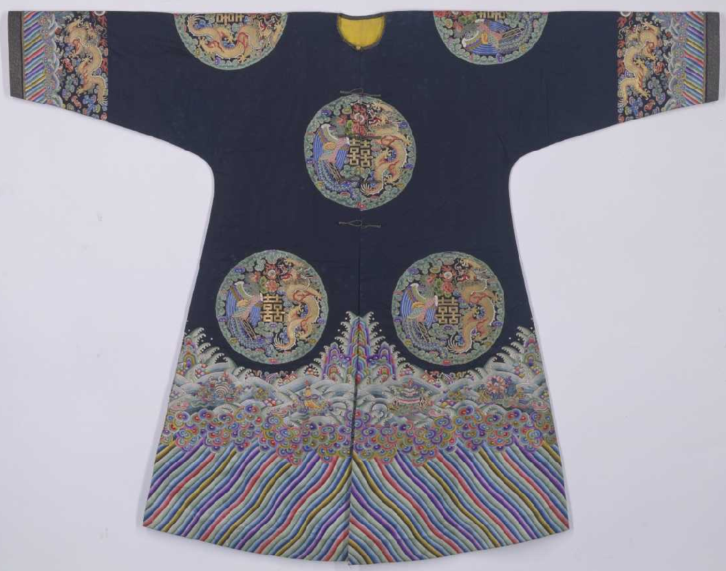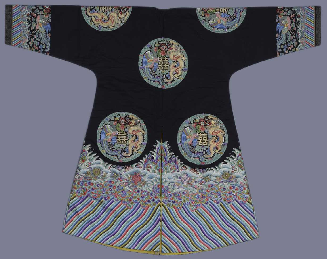 石青色绸绣八团龙凤双喜棉褂,清光绪,身长135cm,两袖通长176cm,袖口宽22cm,下摆宽114cm,后开裾长75cm。清宫旧藏。