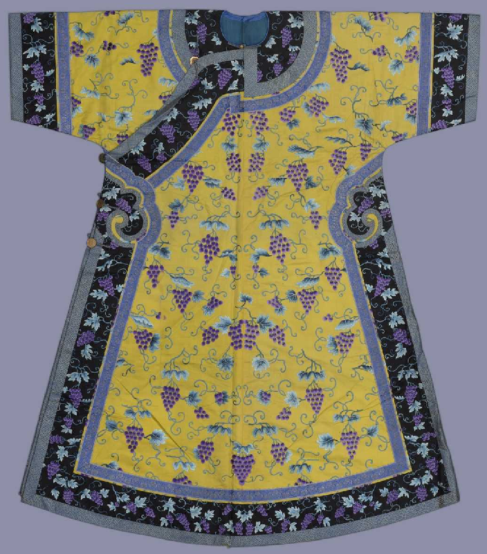 此为晚清皇后、皇太后春秋两季穿用的便服。圆领,大襟右衽,平袖,呈挽袖折叠状,袖长及肘,直身式袍,缀绿色素纺丝绸里,缀铜镀金錾花扣一枚,襟缀铜镀金錾双喜字币式扣四枚。明黄色素绸为面,采用传统的戗针、套针、平针、缠针等针法,绣制折枝葡萄纹,寓意多子多福。葡萄果实饱满均匀,写实逼真,枝蔓线条轻柔委婉,流畅自如,图案大方,疏朗。在袍服面上设计这种花纹,尤显得皇家御用品的端庄大气。镶饰繁复的领、袖边,边饰从里到外分别是蓝色地织金梅兰菊绦、元青色绣葡萄纹边和宝蓝色万字曲水织金缎边。其中元青色绣葡萄纹边的图案与氅衣面料图案相呼应,主次分明,设计主题更为鲜明。
