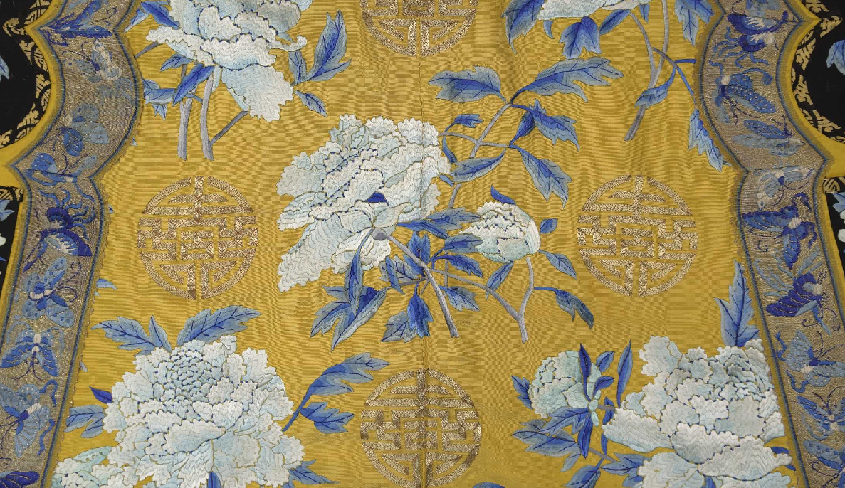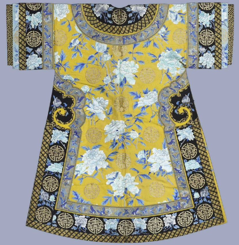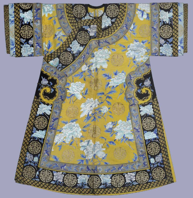 此为清代后妃夏日穿着的便服,圆领,大襟右衽,平袖,直身式袍。挽袖长及肘部,折叠层数多达四层,这是晚清后妃便服的装饰特点之一。左右开裾至腋下,镶饰如意云头,缀铜镀金扣一枚。面料为明黄色素线绸,纬线较粗,织造致密,粗犷挺括,尤其适合绣制较大的花纹。氅衣用白、湖色、浅绿色绣制折枝牡丹花,灰色枝干上,三蓝晕色的叶子飘逸逼真,颇具淡而隽永、雅而不薄的中国传统水墨淡彩的风格,大朵的折枝牡丹间饰平金绣团寿字,在雅致恬淡中彰显皇家御用品的华美富贵。采用绣线较粗,但针脚细密平齐,工整规矩,传统的戗针、套针、缠针、平针、打籽等针法,简洁明快,既有江南刺绣的精妙雅致,又有北方刺绣的粗犷大方。值得注意的是,针绣牡丹花瓣的水路用蓝色丝线做打籽代替勾边,使花瓣极具自然舒展的立体感,风格独具。