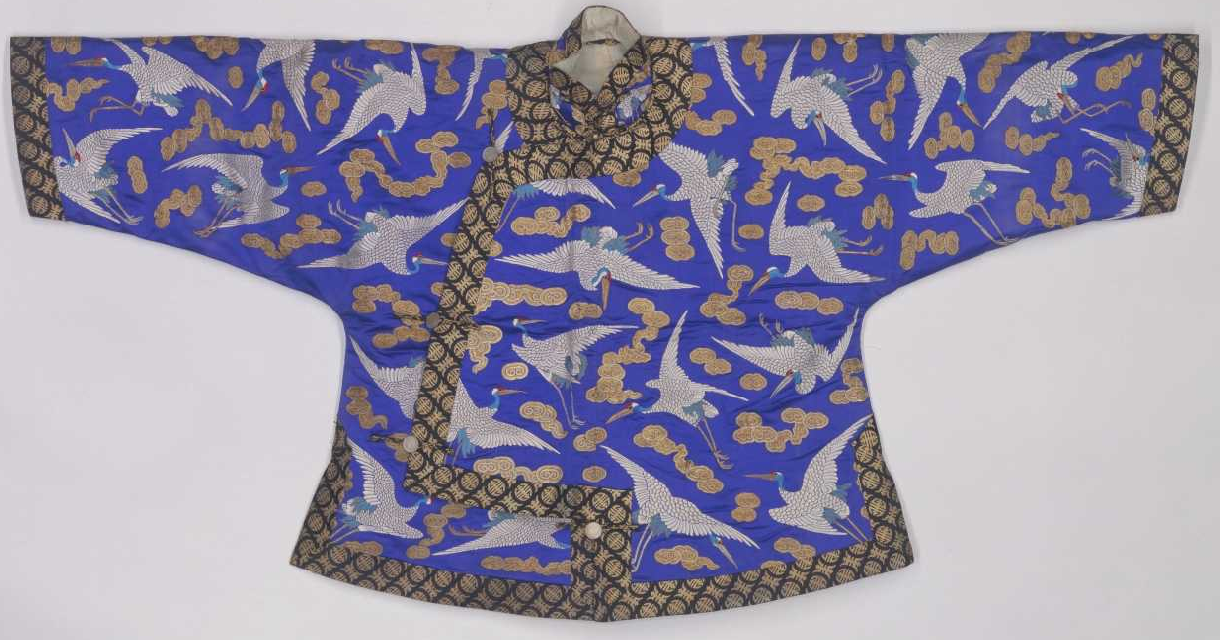 此为清代后妃日常便服。圆立领,右衽琵琶襟,平袖,左右及后开裾。湖色素纺丝绸里,内絮薄绵,领、袖边饰长圆寿字织金缎边,缀盘扣及光素铜扣各一枚,铜鎏金龙纹机制币式扣四枚。精致宝蓝色素缎面。绣丹顶鹤,间饰平金绣如意云。丹顶鹤在传统吉祥图案中是长寿的象征。构图不对称,纹样饱满而不局促,飞翔的仙鹤,姿态各异,动感自然,在宝蓝色地和金色云纹的衬托下,仿佛与蓝天共舞。仙鹤绣工精致,平金绣鹤喙、腿,头顶的红色冠羽用套针和施毛针,身体的羽毛采用刻鳞针,并适当延长羽毛边缘浅灰色扎针的线条,形似施毛针。这种施毛鳞技法,使羽毛更具立体效果。羽毛中部用浅灰色丝线晕色,真实地将仙鹤羽毛表现出来,仿佛是用羽毛粘制而成。仙鹤的尾羽并没有写实的采用黑色,而是用偏绿的宝蓝色绣制,用金线构边。夸张地颜色变换,使仙鹤的色彩不显得呆板单一。清中期以前,这种全身绣制较大仙鹤纹饰的便服非常鲜见,清晚期,注重张扬个性的图案和细节的繁缛装饰成为时尚,宫廷也出现了大量图案寓意丰富,大花纹单位的便服。