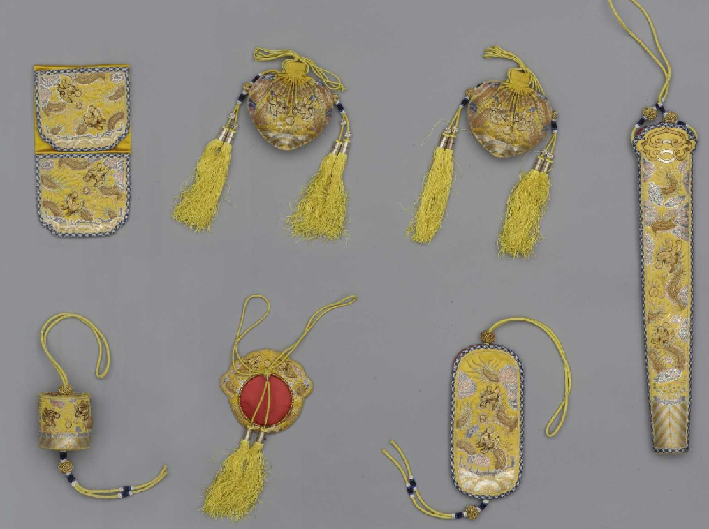活计所用的是明黄色面料和绦带,大量用金,精美的刺绣工艺等特点表明这套活计是由如意馆设计,由内务府承办监制的。