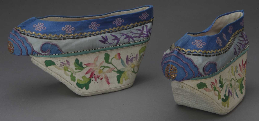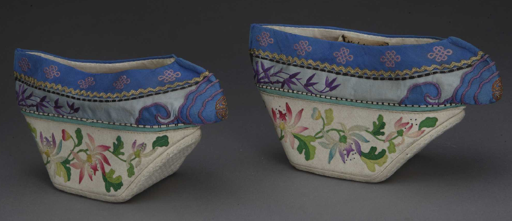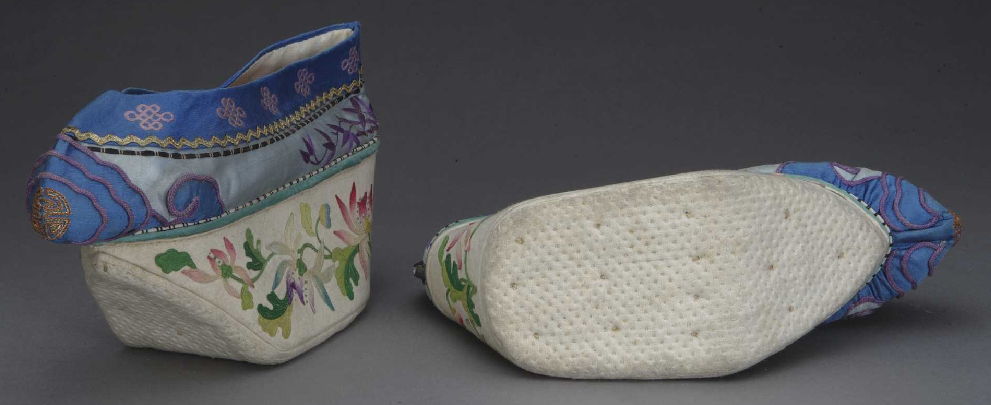 清代后妃用鞋。湖色缎及蓝色缎面,彩色丝线以缠针绣竹叶纹及盘长纹,鞋头以蓝色缎饰如意云纹,纹饰均寓意吉祥。鞋跟为木质,外裱一层白色棉布,棉布外以贴绫方法堆贴花卉纹,色彩斑斓,晕染过度自然。鞋帮与鞋跟之间压一道绿边。