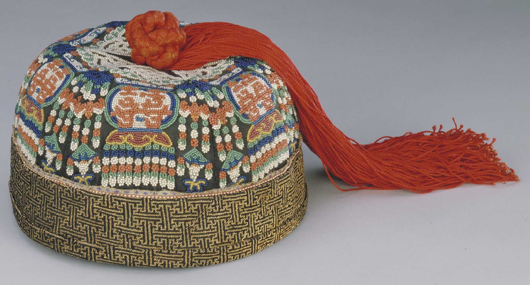 石青色缎穿米珠灯笼纹如意帽,清光绪,高12cm,帽圈直径20cm。清宫旧藏。
