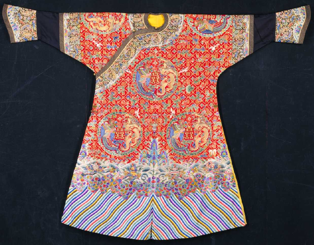 在清代皇后冠服中,无论是纹样设计还是制作工艺,龙凤同合袍的制作过程都最为繁复。这件吉服袍采取二至五色间晕与退晕相结合的装饰方法,在大红色江绸地上,运用平针、平金、戗针、套针、钉线等针法,彩绣八团金龙凤双喜字等纹样。此服构图丰富,绣工精细,设色饱满艳丽,无不衬托出光绪帝大婚时的喜庆与热烈。