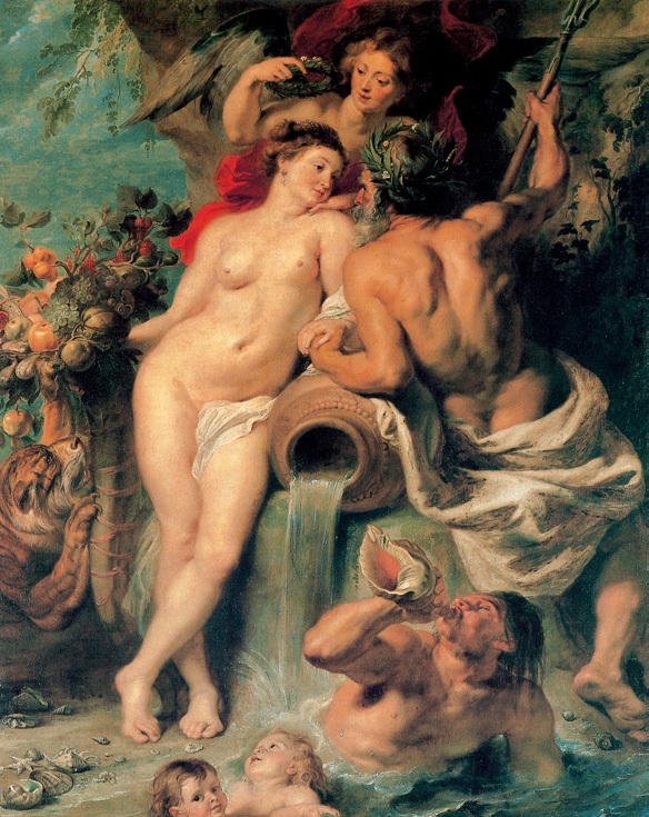 此画又名《斯卡蒂斯河神与安特卫普》。以绘画形式来表现安特卫普市与斯卡蒂斯河的关系,是佛兰德斯画家 中的常见题材。也有人曾解释此画是大地女神与海王的结合。但无论怎样,都是在表现佛兰德斯地区与河海的不可分割。画中的人体丰满健康,少了鲁本斯惯有的肉感与狂热。金字塔形的构图以及平和的色彩在柔和的光线下,显示出诗一般的意境,这种内敛而略带朦胧感的风格在鲁本斯的作品中较为少见。