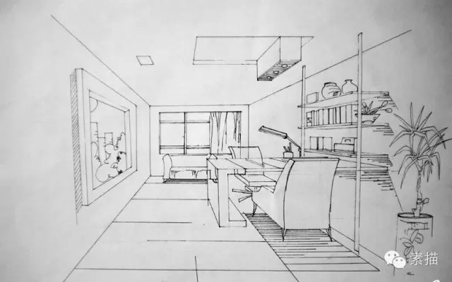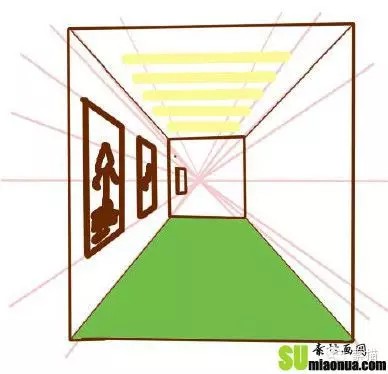 也就是说除了正对着大家的横竖线是平行并且垂直的,其余的线延伸到远处必须都要在由中心点散发出上。(下面这幅图也是一点透视)
