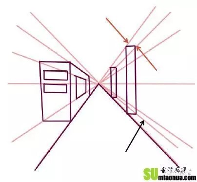 继续观察上面的图片:中间的两条紫线代表着大马路!大马路在远处汇聚到中心点那里。位于马路左边的是一栋楼,因为正对着大家的这个面横竖线都是平行的,所以最前面这个面是一个很正的矩形。然后呢,楼的边缘要按照射线延伸到远处。因为你必须保证楼的这个延长线能通过中心的点。