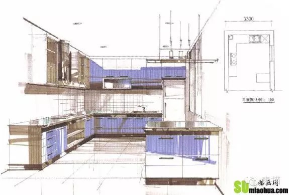 上面这幅图是一点透视的厨房。正对着大家的这些柜子都是正矩形。大家仔细观察一下一点透视的室内,因为下节课我们要和两点透视做区分。