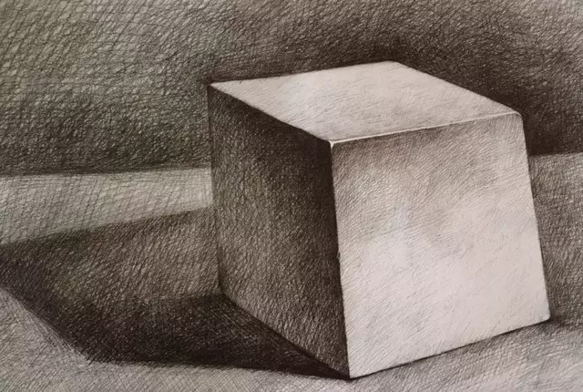在掌握整体黑、白、灰关系的前提下,从正方体各局部进行深入刻画,并绘制出背景的灰调子,使画面的黑白灰层次更丰富,虚实关系更明确,空间感更强。