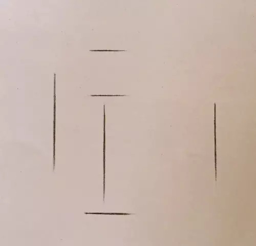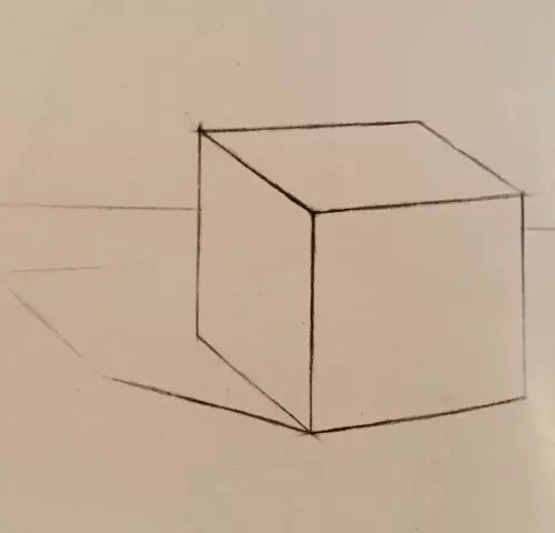 考虑构图,确定正方体在画面中的位置。从整体观察,比较和分析结构比例,根据正方体的比例关系,用轻淡的长直线绘制出基本形体,并注意其透视关系。