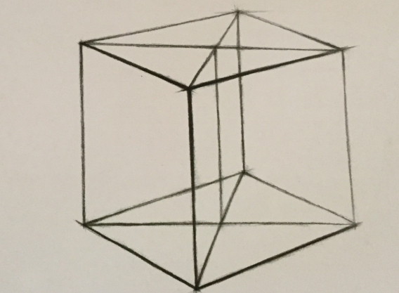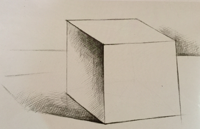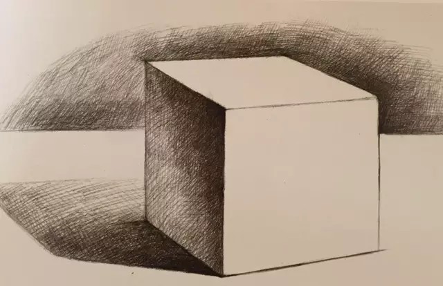 在光线的作用下,从整体的明暗关系中,明确受光的亮面和背光的暗面。从正方体的明暗交界线入手,铺设暗面和阴影,使画面表现出大的明暗关系。