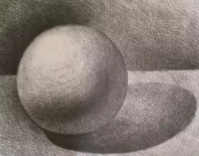 在确定了主光源的情况下,仔细认真地分析光线在球体上产生的黑、白、灰层次变化,在找准明暗交界线的基础上,逐步绘制好暗部及投影,利用明暗层次塑造球体的立体感。在绘制局部的同时,也要注意画面的黑、白、灰层次关系,使球体的黑、白、灰层次更丰富,画面虚实关系更明确。
