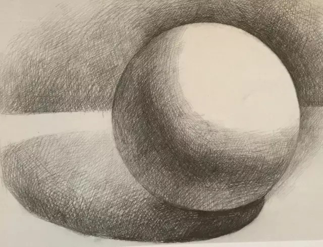 在光线的作用下,从球体整体的明暗关系中,明确出受光的亮面、背光的暗面和明暗交界线的位置。首先从明暗交界线入手,铺设暗面,注意暗面和投影要一起绘制。