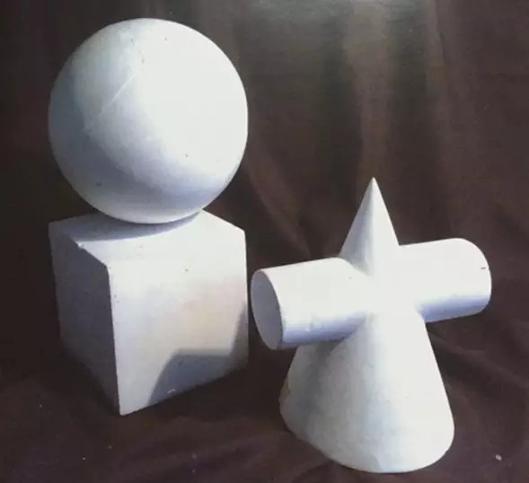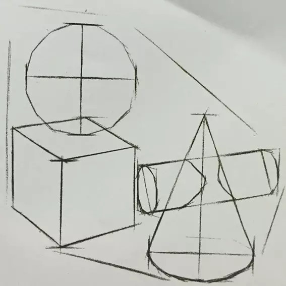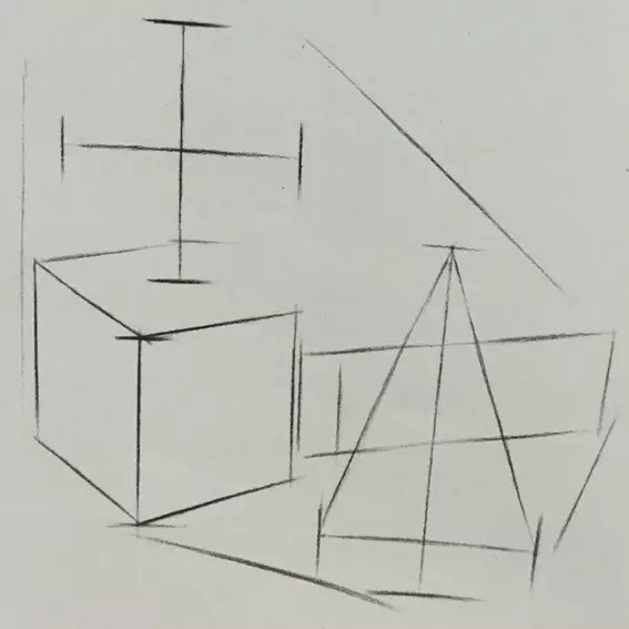 石膏几何形体组合写生的绘制对象更多,造型形态也更加复杂。对象的多种透视现象混杂在同一画面中,增加了透视理解的难度,是几何体造型的综合性训练。