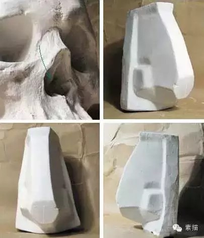 2 . 对于鼻子中线的起伏变化, 大家一定要结合下图中鼻骨和石膏鼻子分面的形状来理解。首先,鼻梁的骨骼要略高一些, 往下接着向下倾斜的软骨。因此, 鼻子中线的这种起伏变化也就决定了鼻头和鼻梁上的高光不会连接在一起, 并且鼻头的高光要亮与鼻梁的高光。