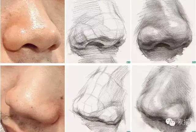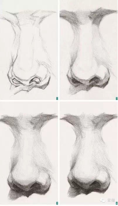 1 . 不管表现何种角度的鼻子, 都要将其形体归纳进一个简单的几何体中,然后分析它的黑白灰关系。如下图, 在顶侧光的情况下, 鼻子的底部最暗、侧面灰、正面亮。接下来, 根据鼻子内在的结构画出这几个面的中微弱的深浅变化, 那画面的黑、白、灰节奏就非常丰富,鼻子的体积感也就非常强了。