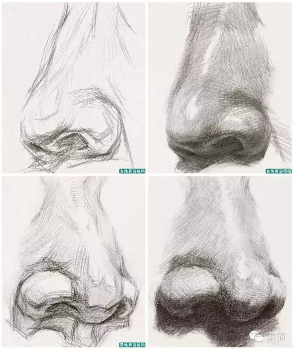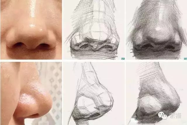 鼻底: 鼻底有明显的明暗交界线和反光, 是表现难点, 注意它丰富的明暗和虚实变化。初学鼻子要加强对鼻部结构的理解, 注意各部位之间的穿插、前后、虚实等关系,并将鼻子的各个形体进行归纳和概括, 理解鼻骨体块、鼻头体块和鼻翼体块的关系。