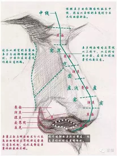 鼻梁: 鼻梁要注意中间与两侧三个面的形状和结构变化及与其相邻部分的衔接。鼻子侧面略微鼓起的位置, 正好处在鼻梁向外延伸这一带上。因此, 鼻子在抓住最大的明暗交界线和鼻子侧面与暗面衔接处的深浅变化后,还要把侧面的这种形体变化表现出来。
