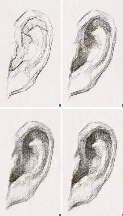 耳轮:由于耳轮的外部形态呈现方中有圆、圆中带方的感觉,所以耳轮外轮廓交界线从上到下的粗细、深浅和方圆节奏就要给予重视,并且还要在耳轮上分出交界线、反光、灰面和亮面等。