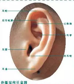 耳朵的形状是不规则的壳状,其轮廓呈C型,上宽下窄,中央是一个凹形碗状体。耳部主要由耳轮、对耳轮、耳屏、三角窝和耳垂等几个部分组成。(具体参考上图)
