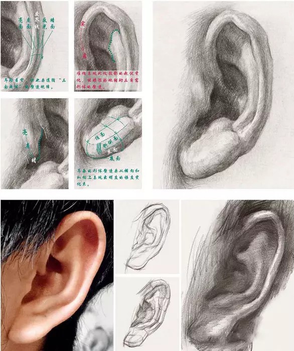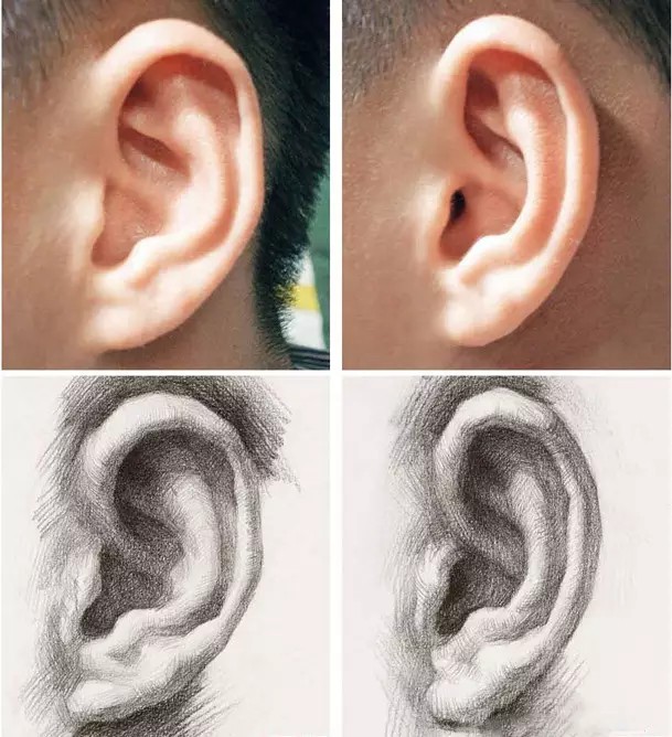 如果我们是在正面或者四分之三侧面且对象耳廓处于暗部中, 那就不应该把耳朵画得过于突出,主动将其虚化。但如果我们的绘画视角处于对象侧面时,那耳朵就需要重点刻画了。(下边三幅图)耳朵各部位形体因透视变化产生的长短、深浅、虚实等变化是需要在塑造时注意的。