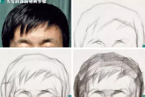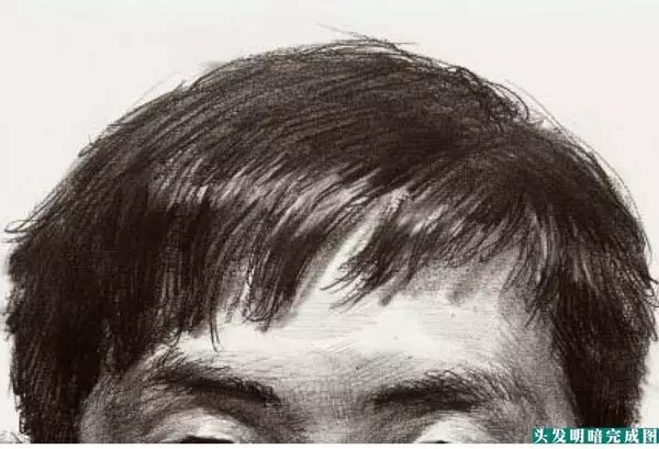 另外,还要分出头发内轮廓中额头上方以及左右两侧头发生长的不同方向。一般情况下,额头上方的头发从里往外长,高光远离发髻线,会在正面形成一个立面的暗部。左右两侧鬓角的头发是从头皮往外长,在光线影响下,高光会直接出现,不存在立面的暗部。最后,对于头发投到额头上的投影和投影的形状、深浅变化都是需要认真把握的。