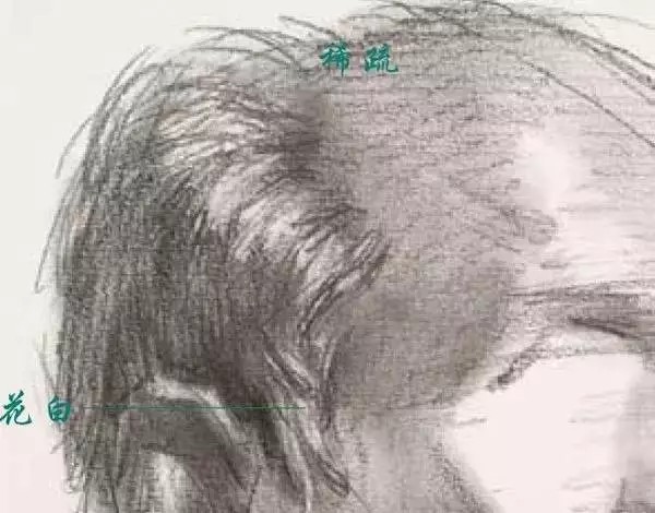另外,在表现老年人头发的高光时千万不能忽略了老年人头发本身所具备的特征,比如头发比较稀疏、花白发居多等,因此在用笔和色调上要注意,不能表现得过于浓密。