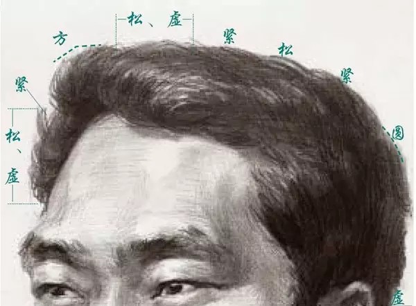 首先,要把头发形体的变化与头骨的结构结合起来,找出头部正面、侧面及顶面最重要的三条明暗交界线的位置(结合下图)。同时,由于前后空间的影响,所有交界线都要具备前实后虚的特性。其次,头发的顶面到侧面最重的交界线之间往往会形成一个斜侧的灰面。同时,我们还要注意高光从前到后、从左到右在明度变化上的差异。