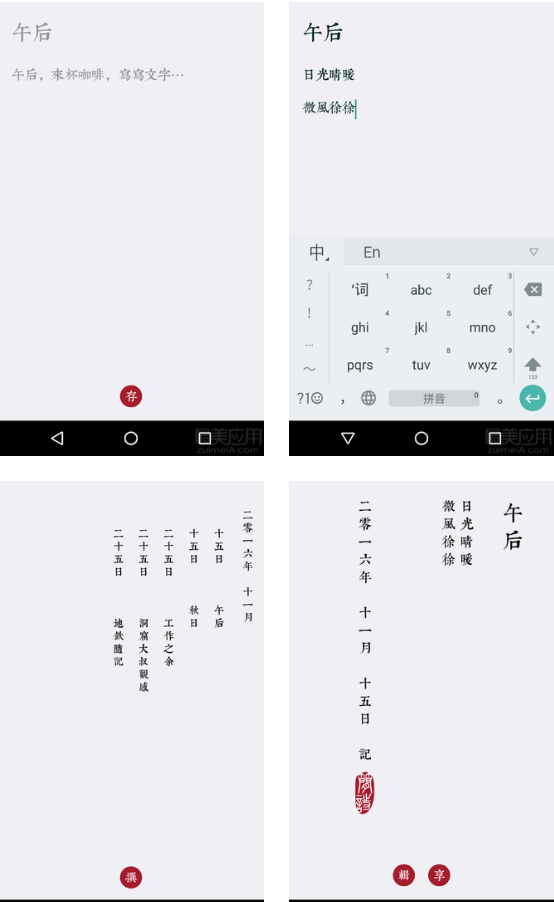 写作页面非常简单,一句标题,一句话来做引导,随时保存。写作的时候,无需顾及太多,用心记录就好。写好的日记会以竖排(默认)的形式呈现,十分文艺,如果不喜欢竖排版,也可以在设置中取消竖排文字阅读。写作日期会自动填写,还会有一个印有简诗字样的落款。整体写作的感受就是流畅,方便,且文艺感十足。